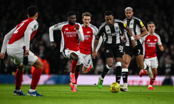 LONDON, ENGLAND – JANUARY 07: Joe Willock of Newcastle United (28) controls the ball during the Carabao Cup Semi Final First Leg match between Arsenal and Newcastle United at Emirates Stadium on January 07, 2025 in London, England. (Photo by Serena Taylor/Newcastle United via Getty Images)