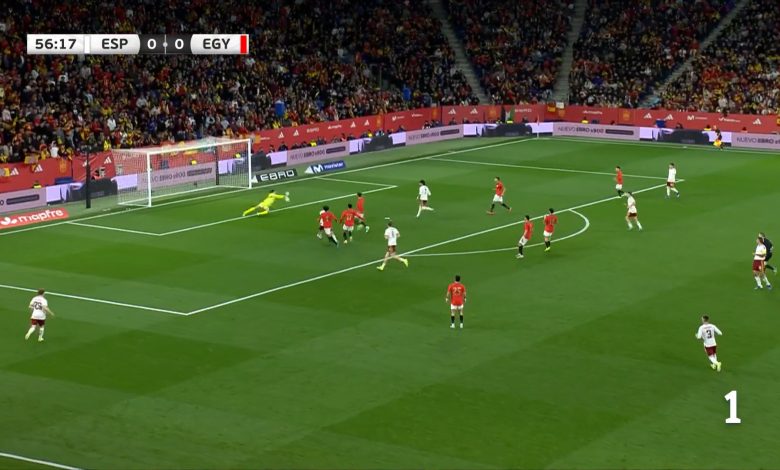 فرض المنتخب الإسباني سيطرته في فترات من الشوط الأول، مع محاولات هجومية أبرزها عن طريق لامين يامال، بينما كادت مصر أن تخطف التقدم في الدقيقة 29 بعدما سدد عمر مرموش كرة قوية اصطدمت بالقائم.